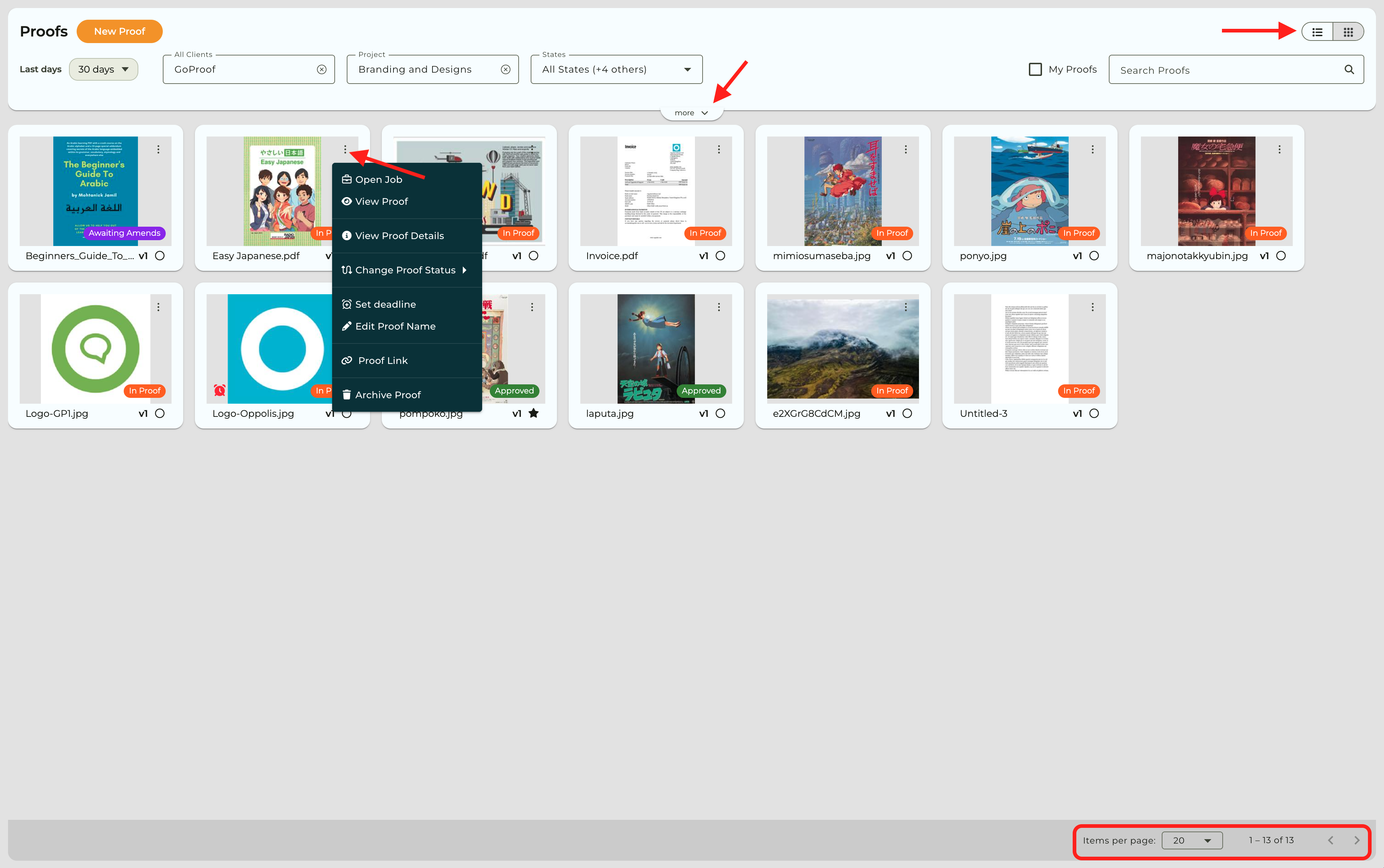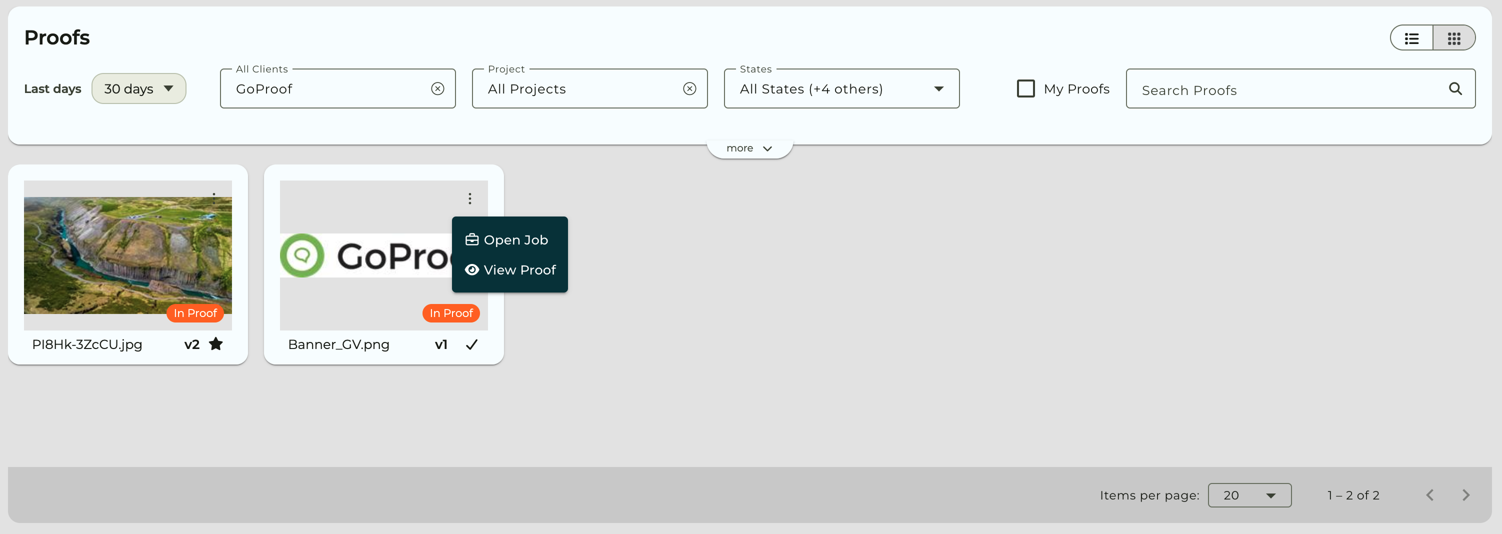 Use the Items per page selector at the bottom of the page to control how many proof cards are shown.