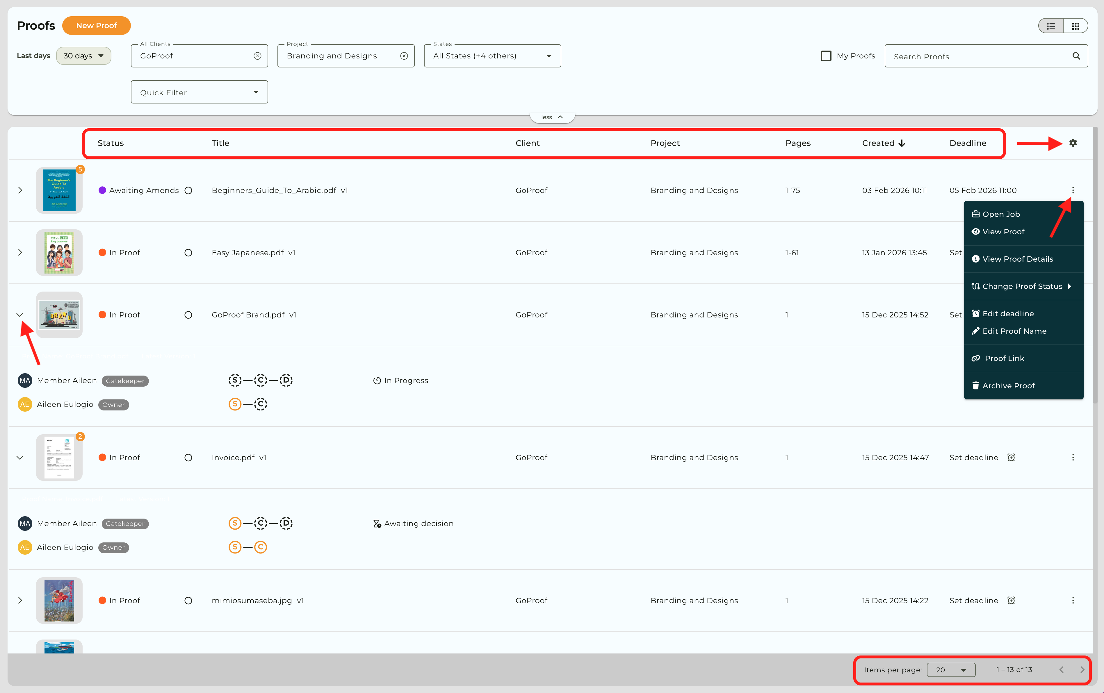 Click on any column header to sort proofs in ascending or descending order by Title, Created date, Deadline or other available columns.