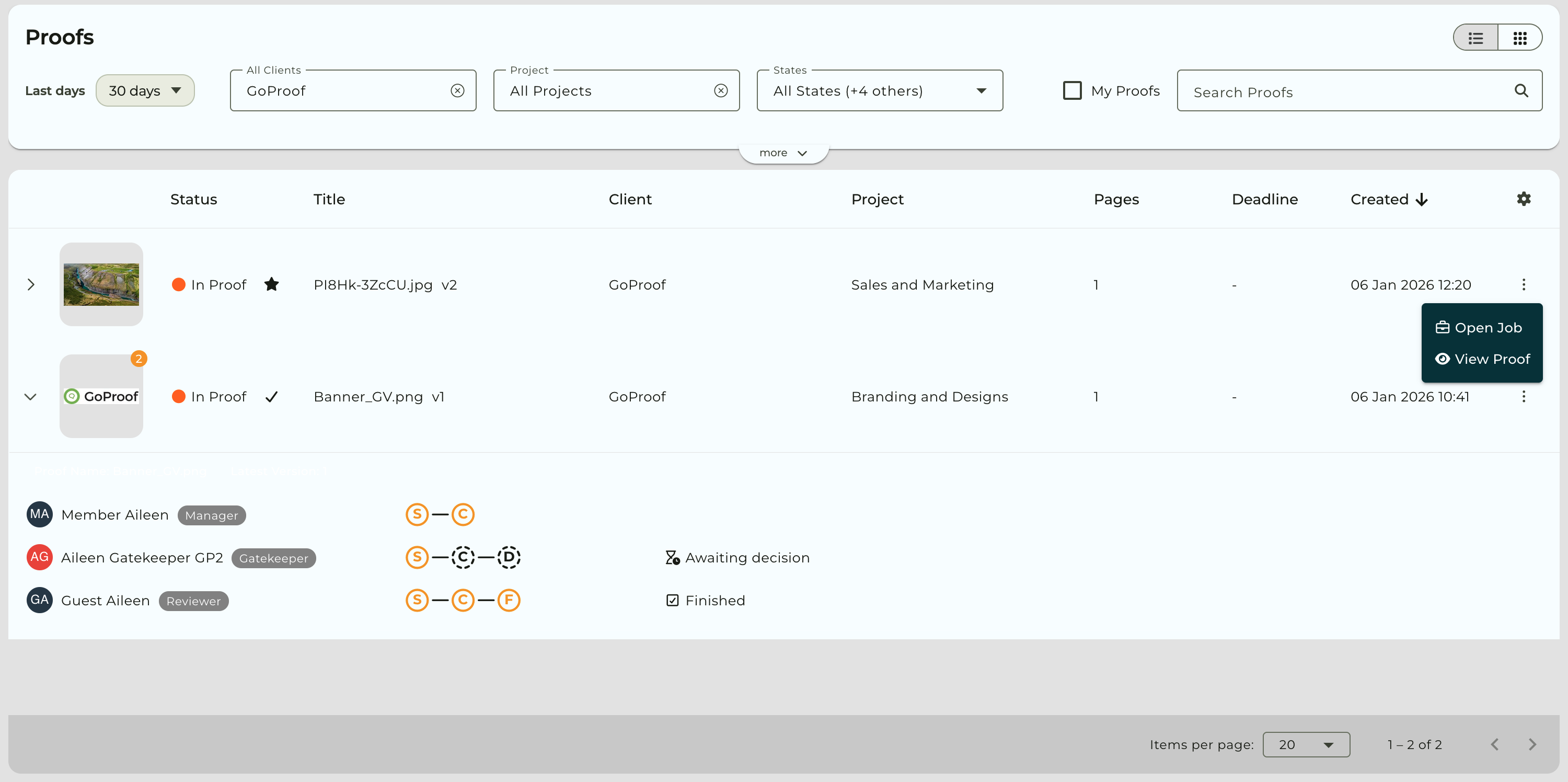 The Gallery view shows large thumbnails of your proof for a visual overview. Click on the proof cards/thumbnail to open the proof to review.